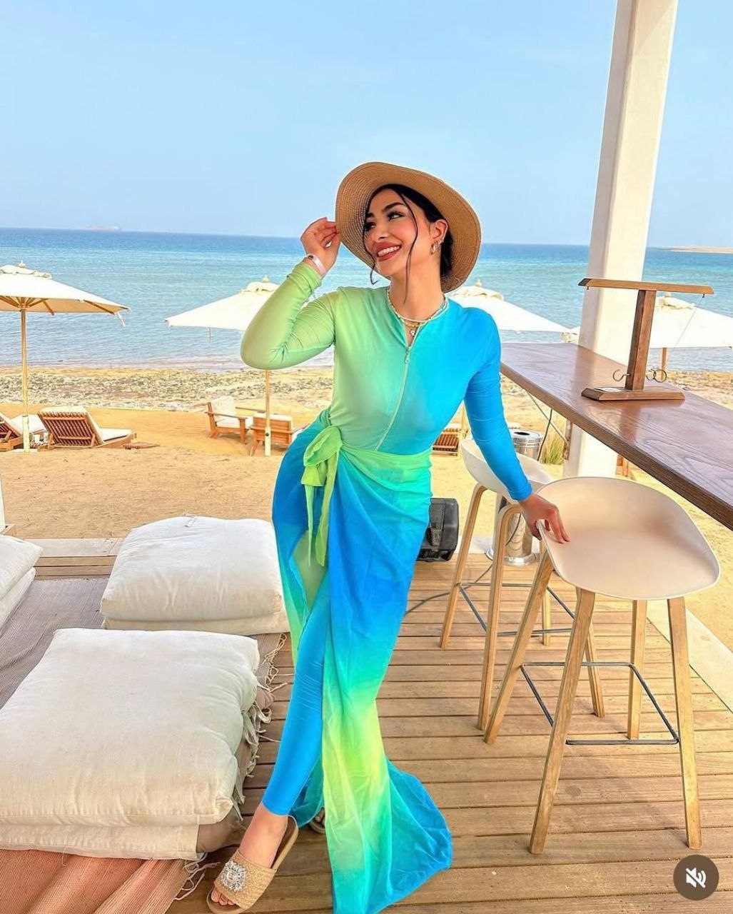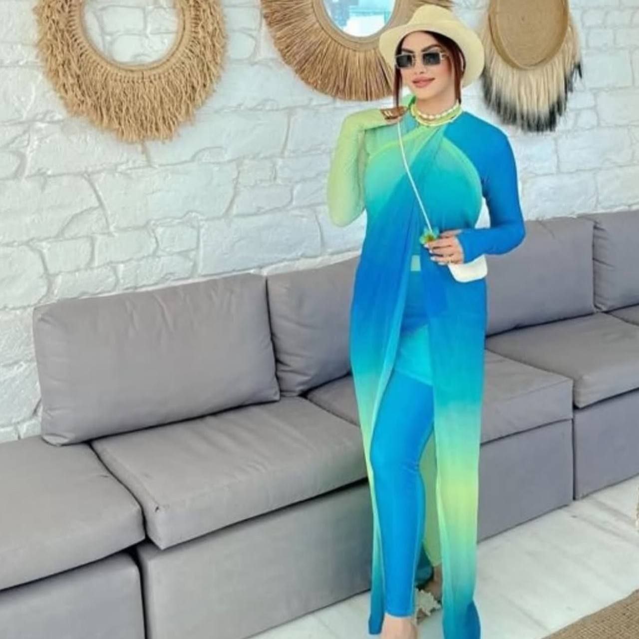 Offrez-vous ce magnifique ensemble aux dégradés de bleu et vert, parfait pour profiter des journées ensoleillées avec style et confort.