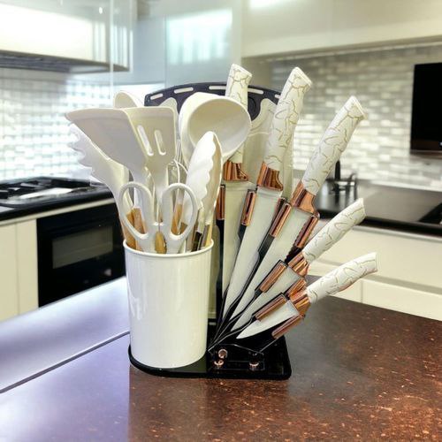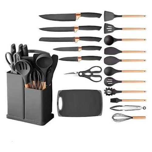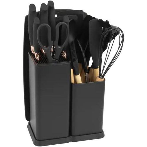 Set d’ustensiles de cuisine premium : 19 pièces avec couteaux, silicone et bois (Noir & Blanc)Set d’ustensiles de cuisine premium : 19 pièces avec couteaux, silicone et bois (Noir & Blanc)